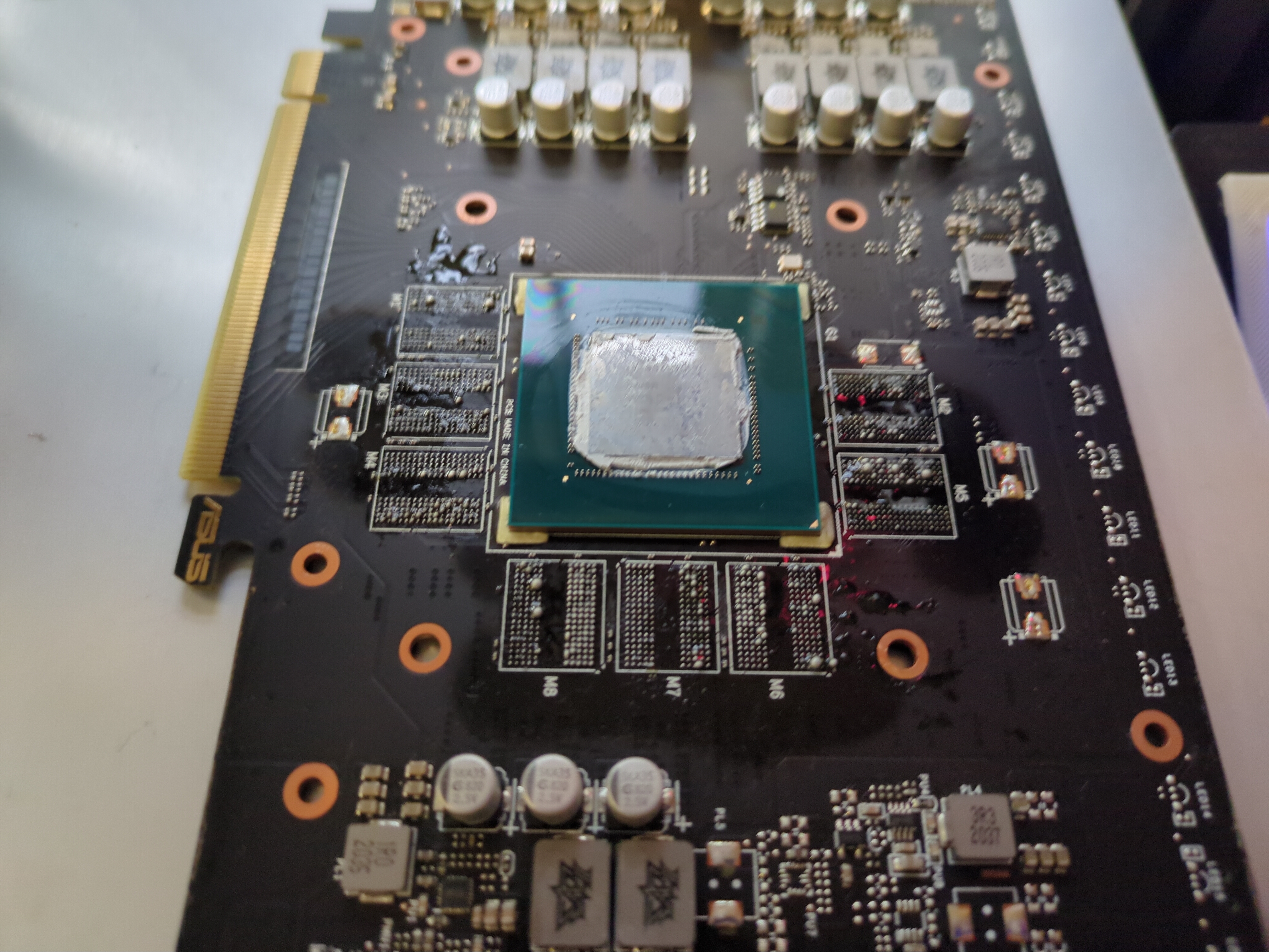 Tap the side of the chip occasionally after the flux mostly boils away. This depends on the flux, but I noticed after it stopped smoking so much, the solder is near liquid. And yes use a fume extractor because there will be LOTS and LOTS of flux fumes. You will smell like flux after you are done. When the solder is fully molten, the chip should move when you tap it. Heat the chip for 5 more seconds, then carefully slide the tweezer underneath the chip, and slowly lift up and away. There were tiny 0201 capacitors next to the chips and I only knocked off one. Just be very patient and carefully lift the chip. Of course, keep the hot air over the chip while you are doing this. A video is a thousand words, so watch GPU Solutions video to see how its actually done. This is what the 3060ti looked like after: