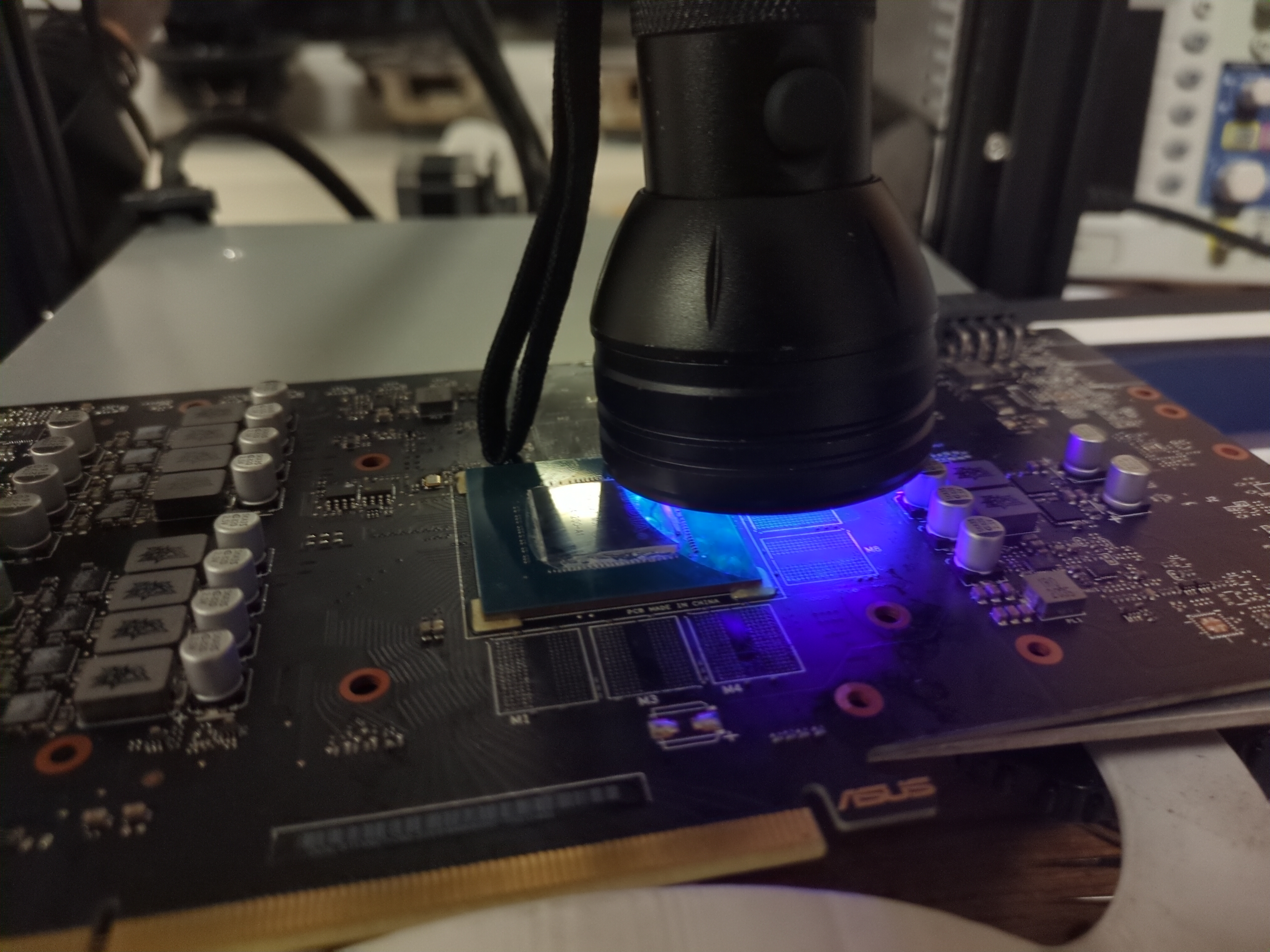 Then use a GOOD quality desoldering wick. I recommend 1-1.5mm Goot wick, but this time I am trying out Chipquik 1.5mm desoldering wick I bought on Mouser. Its a very stiff wick and needs lots of additional flux. I only had 3mm Goot wick, too wide. Just make sure to trim it constantly, so you are not oversaturating the wick. Put more flux on the pads and CAREFULLY drag the soldering iron over the desoldering wick. Put minimum pressure. GPU Solutions should go over it in his video. MAKE SURE to practice this on a dead card and hone your technique so you don’t rip any pads. It helps to use a VERY THICK tip so it has a lot of heat mass. Remember, keep the board on the preheater so its less work for your soldering iron. Now even after being super careful, I damaged some tracks on the memory. Inspect it carefully under a bright light. I used some UV green solder mask and applied a SUPER thin coating on the damaged tracks in between the pads. Don’t put too much or the new chip won’t sit flat. This prevents accidental solder bridges when resoldering, then leave it under a UV flashlight for 5 minutes or however long it takes for the coating to cure. MAKE SURE to clean the board from ALL flux before you do this, so it sticks well to the PCB.